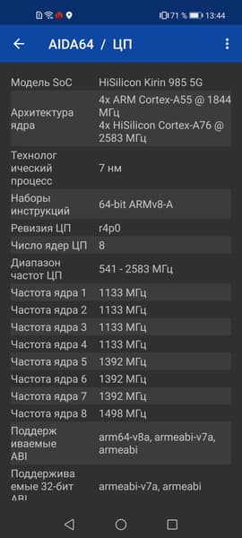 - SoC Kirin 985 5G, 8 ядер (1×Cortex-A76 @2,58 ГГц + 3×Cortex-A76 @2,40 ГГц + 4×Cortex-A55 @1,84 ГГц)