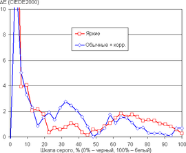 В случае профиля Обычные баланс оттенков на шкале серого хороший, так как на белом поле цветовая температура лишь немного выше стандартных 6500 К (порядка 6700 К), и отклонение от спектра абсолютно черного тела (ΔE) 3 единицы, что для потребительского устройства считается очень хорошим показателем.