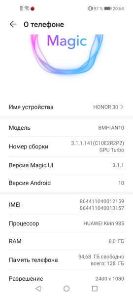 Основные характеристики Honor 30 (BMH-AN10)