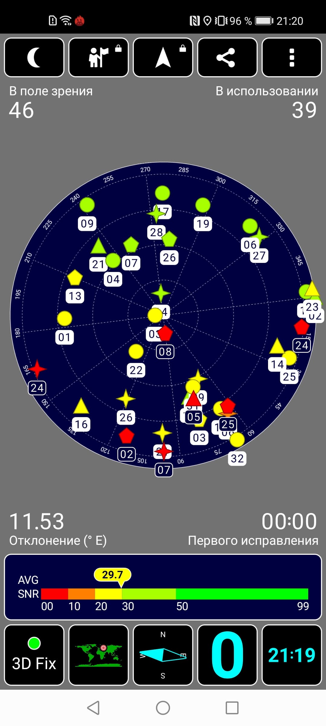 Навигационный модуль работает с GPS (с A-GPS), с отечественной Глонасс, с китайской Beidou и с европейской Galileo. Первые спутники при холодном старте обнаруживаются не молниеносно, но более-менее быстро, точность позиционирования не вызывает претензий.