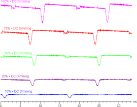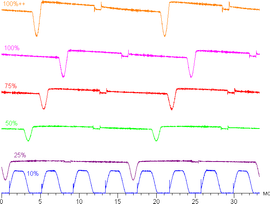 Только на низком уровне яркости появляется значимая модуляция с частотой примерно 240 Гц. На рисунке ниже приведены зависимости яркости (вертикальная ось) от времени (горизонтальная ось) для нескольких значений настройки яркости: