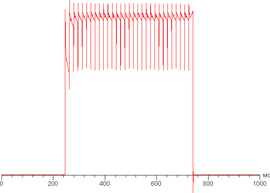 Переключение состояния элементов матрицы выполняется практически мгновенно, но на фронте включения может присутствовать ступенька шириной примерно 17 мс (что соответствует частоте обновления экрана в 60 Гц). Например, так выглядит зависимость яркости от времени при переходе от черного к белому и обратно: