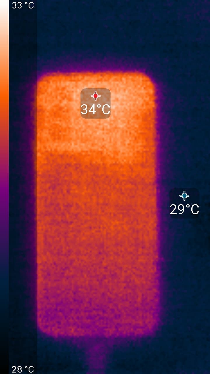 Нагрев больше в верхней части аппарата, что, видимо, соответствует расположению микросхемы SoC. По данным теплокамеры, максимальный нагрев составил всего 34 градуса (при температуре окружающего воздуха в 24 градуса), это относительно немного.