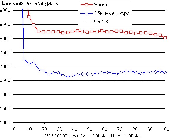 На графиках ниже кривые Яркие соответствуют результатам без какой-либо коррекции цветового баланса (профиль Яркие), а кривые Обычные + корр. — данным, полученным после выбора профиля Обычные и ручной коррекции цветового баланса (точка на круге коррекции — как на снимке выше). (Самые темные области шкалы серого можно не учитывать, так как там баланс цветов не имеет большого значения, да и погрешность измерений цветовых характеристик на низкой яркости большая.)