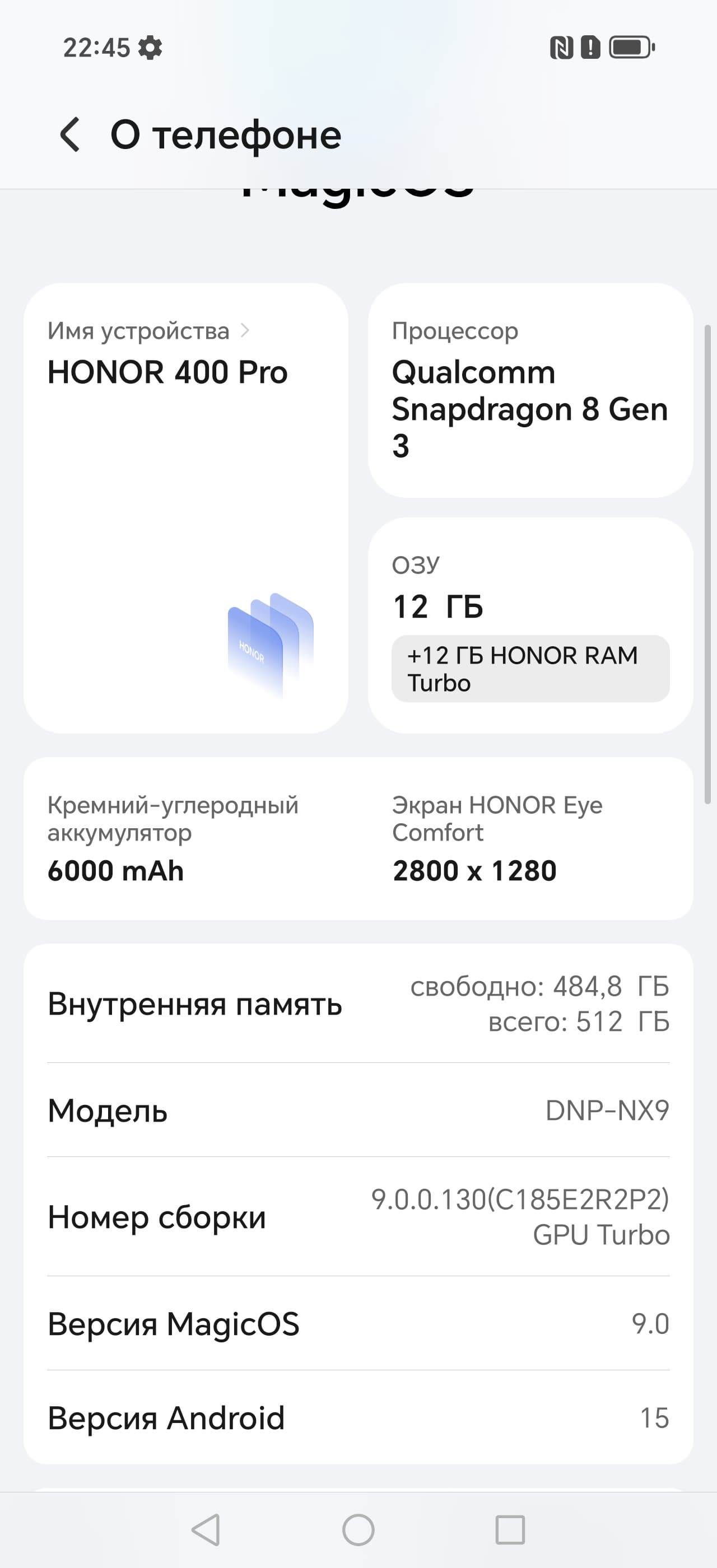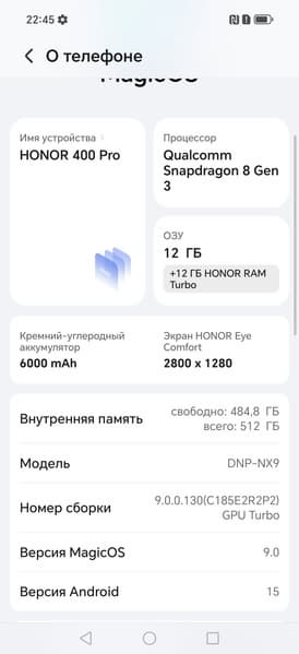 В Honor 400 Pro используется кремний-углеродный аккумулятор емкостью 6000 мАч. Поддерживается быстрая 100-ваттная проводная зарядка. На практике буквально за 15 первых минут батарея смартфона успела зарядиться до 50%. Об уровне автономности подробнее расскажут последующие тесты, но уже понятно, что она здесь серьезная. Также смартфон поддерживает и 50-ваттную беспроводную зарядку.