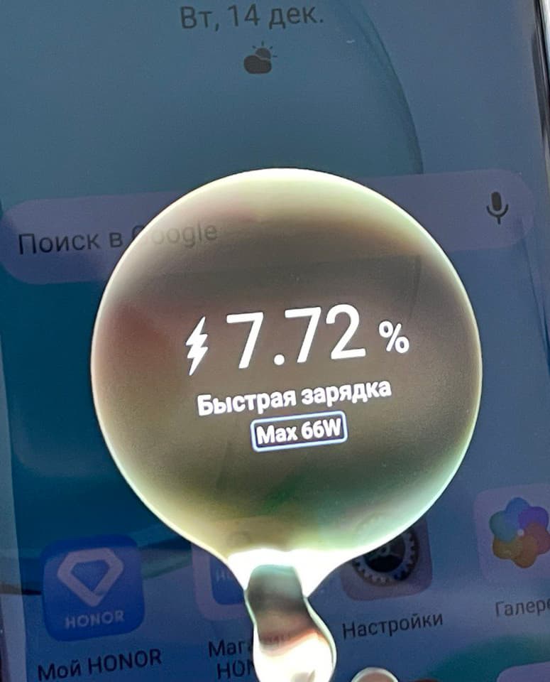 Подключаем зарядку. На экране появляется значок с двумя молниями, это означает «супербыструю» зарядку. Чтобы произвести впечатления, телефон показывает уровень заряда с точностью до сотых долей процента — цифры бегут, наглядно видно скорость.