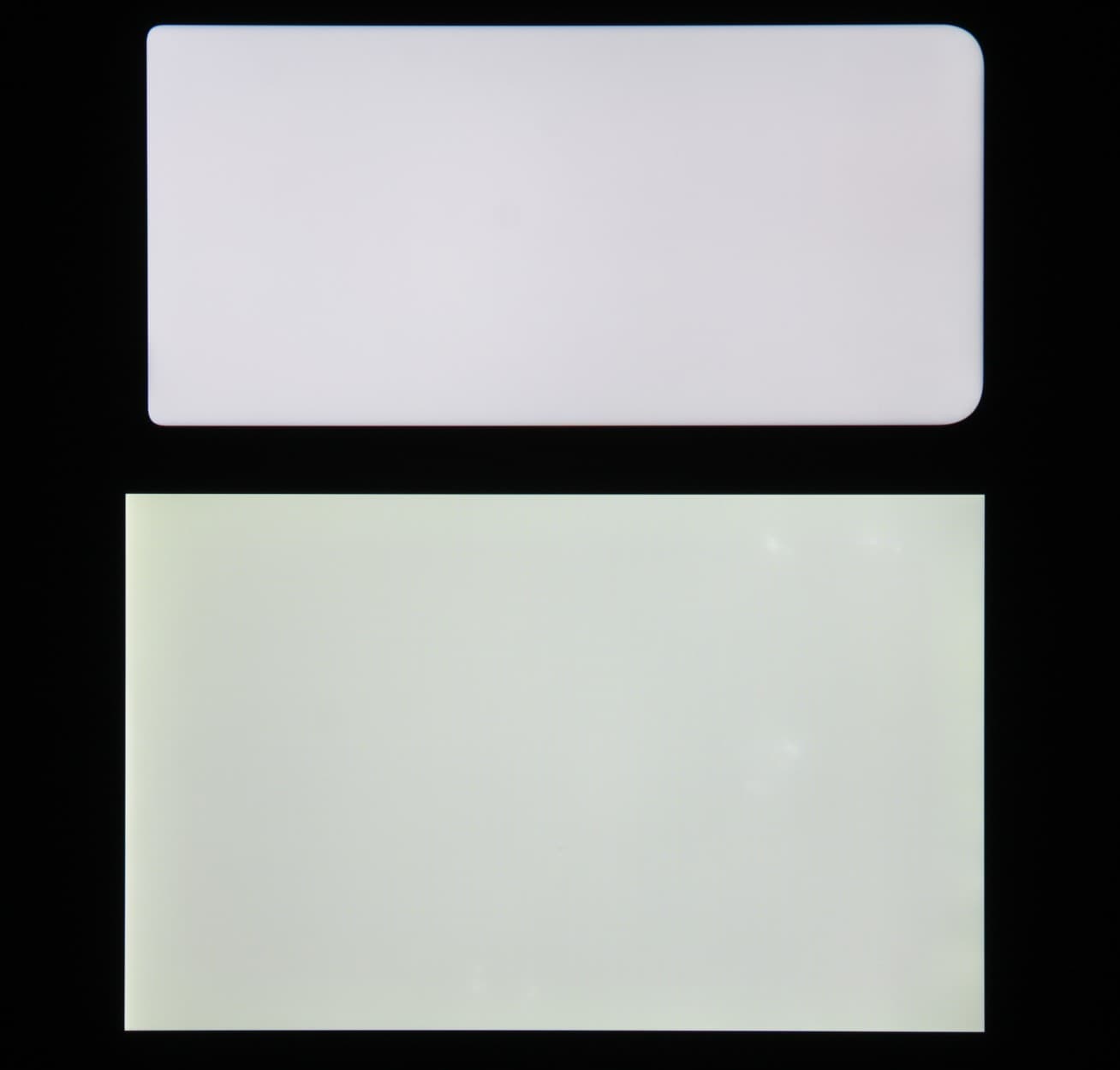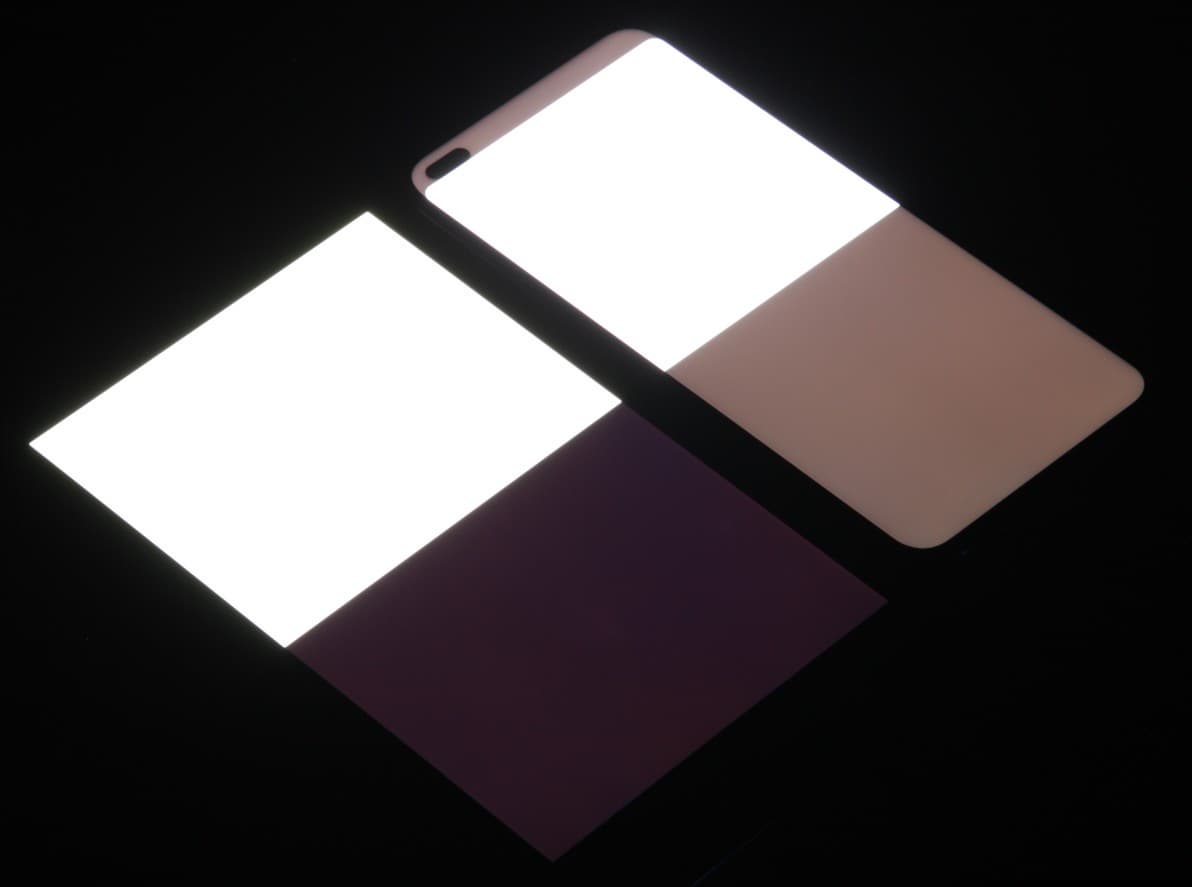 Яркость под углом у экранов уменьшилась (как минимум в 4 раза, исходя из разницы в выдержке), но у смартфона яркость под этим углом все же выше. Черное поле при отклонении по диагонали высветляется сильно, но остается условно нейтрально-серым (так видно глазами). Фотографии ниже это демонстрируют (яркость белых участков в перпендикулярном плоскости экранов направлении одинаковая!):