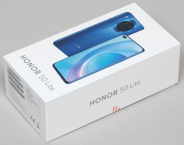 Honor 50 Lite поставляется в твердой картонной упаковке с лаконичным оформлением.