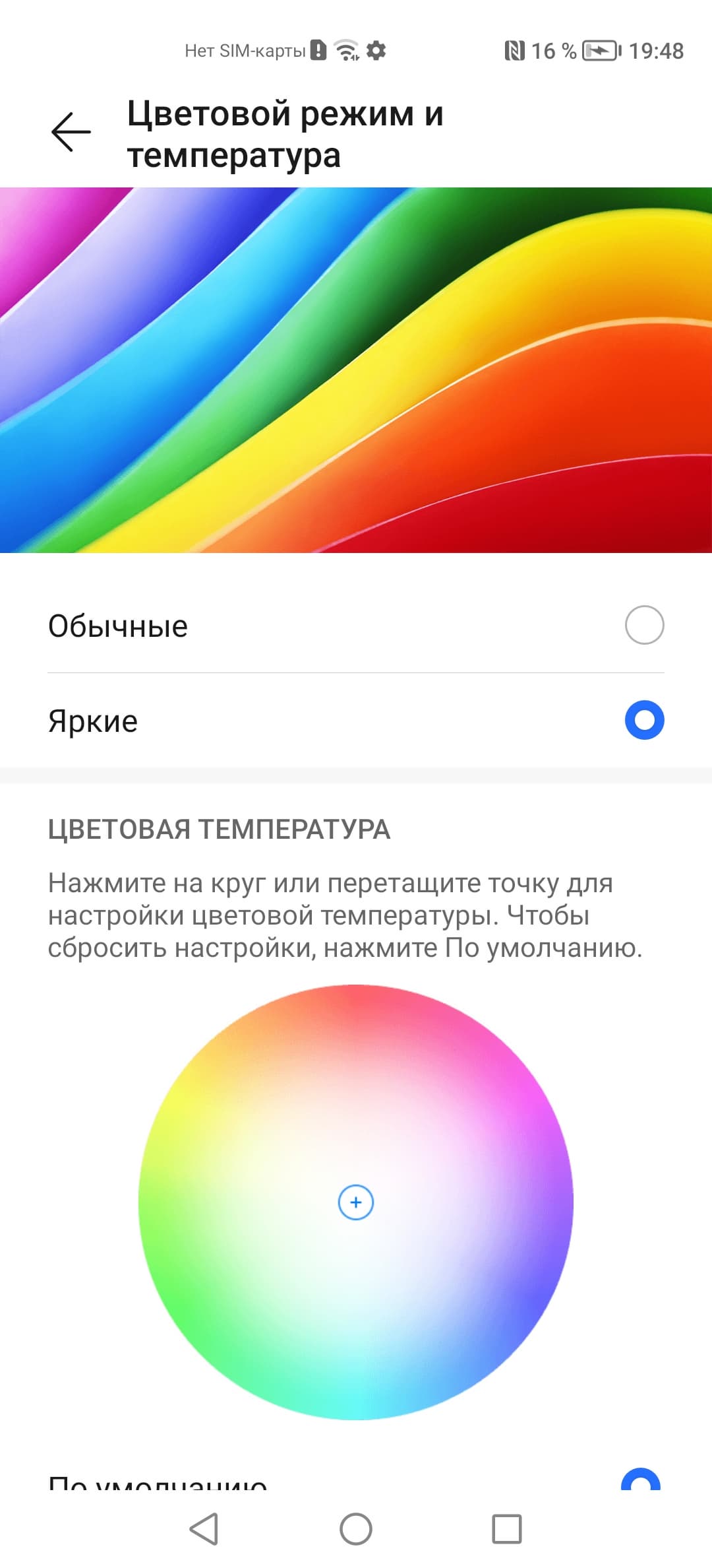 Впрочем, не все так плохо: при выборе профиля Обычные в настройках экрана охват сжимается до границ sRGB: