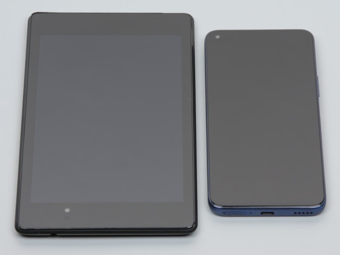 Лицевая поверхность экрана выполнена в виде стеклянной пластины с зеркально-гладкой поверхностью, устойчивой к появлению царапин. Судя по отражению объектов, антибликовые свойства экрана лучше, чем у экрана Google Nexus 7 (2013) (далее просто Nexus 7). Для наглядности приведем фотографию, на которой в выключенных экранах отражается белая поверхность (слева — Nexus 7, справа — Honor 50 Lite, далее их можно различать по размеру):
