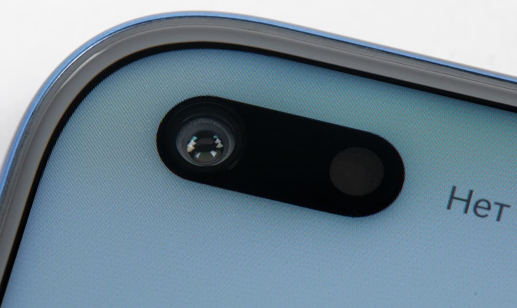 Фронтальная камера установлена за продолговатым вырезом в матрице и аккуратно убрана в угол, где ей самое место. Выглядит это так, словно камера двойная, но в действительности в вырезе рядом с объективом расположены датчики освещенности и цветовой температуры — им пришлось переехать сюда из-за того, что кромка сверху очень узкая. Светодиодного индикатора событий, к сожалению, нет.