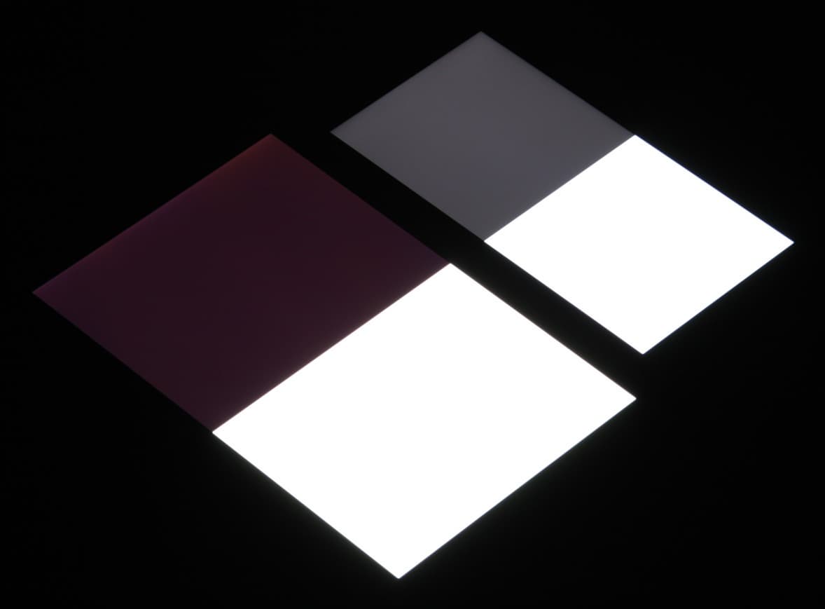 Яркость под углом у экранов уменьшилась (как минимум в 5 раз, исходя из разницы в выдержке), но в случае Honor 7C падение яркости больше. Черное поле при отклонении по диагонали высветляется сильно, но остается условно нейтрально-серым по оттенку. Фотографии ниже это демонстрируют (яркость белых участков в перпендикулярном плоскости экранов направлении одинаковая!):