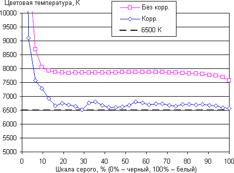 В итоге визуально цвета на этом экране не отличаются от естественных. Баланс оттенков на шкале серого хороший, так как цветовая температура не сильно выше стандартных 6500 К, и отклонение от спектра абсолютно черного тела (ΔE) ниже 10, что для потребительского устройства считается приемлемым показателем. При этом цветовая температура и ΔE мало изменяются от оттенка к оттенку — это положительно сказывается на визуальной оценке цветового баланса. (Самые темные области шкалы серого можно не учитывать, так как там баланс цветов не имеет большого значения, да и погрешность измерений цветовых характеристик на низкой яркости большая.)