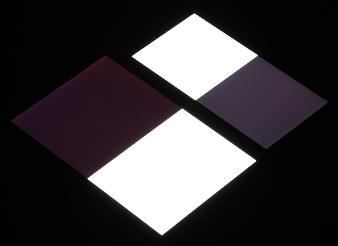 Яркость под углом у экранов уменьшилась (как минимум в 5 раз, исходя из разницы в выдержке), но в случае Honor 7X падение яркости чуть больше. Черное поле при отклонении по диагонали высветляется в средней степени и приобретает фиолетовый оттенок. Фотографии ниже это демонстрируют (яркость белых участков в перпендикулярном плоскости экранов направлении одинаковая!):