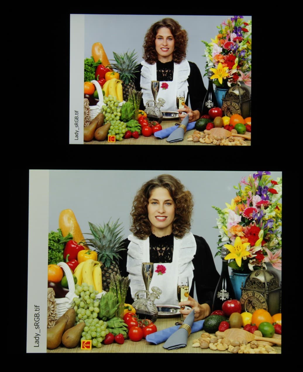 На графиках выше кривые Без корр. соответствуют результатам без какой-либо коррекции цветового баланса, а кривые Корр. — данным, полученным после сдвига точки в указанное на снимке выше положение. Видно, что изменение баланса соответствует ожидаемому результату, так как цветовая температура приблизилась к стандартному значению, а ΔE уменьшилась. Какая-то польза от такой коррекции есть, но максимальная яркость уменьшилась до 390 кд/м², а ее и так не избыток, кроме того, характер полученных зависимостей показывает, что коррекция выполняется цифровым способом, что может приводить к уменьшению количества отображаемых оттенков. Отметим, что данная функция реализована в варианте для галочки, так как нет численного отражения коррекции, а диапазона недостаточно для коррекции как ΔE, так и цветовой температуры. Хорошо хоть поле для замера цветового баланса в данном случае есть, да и то, оно тут случайно, так как в данном случае нет выбора цветового профиля.
