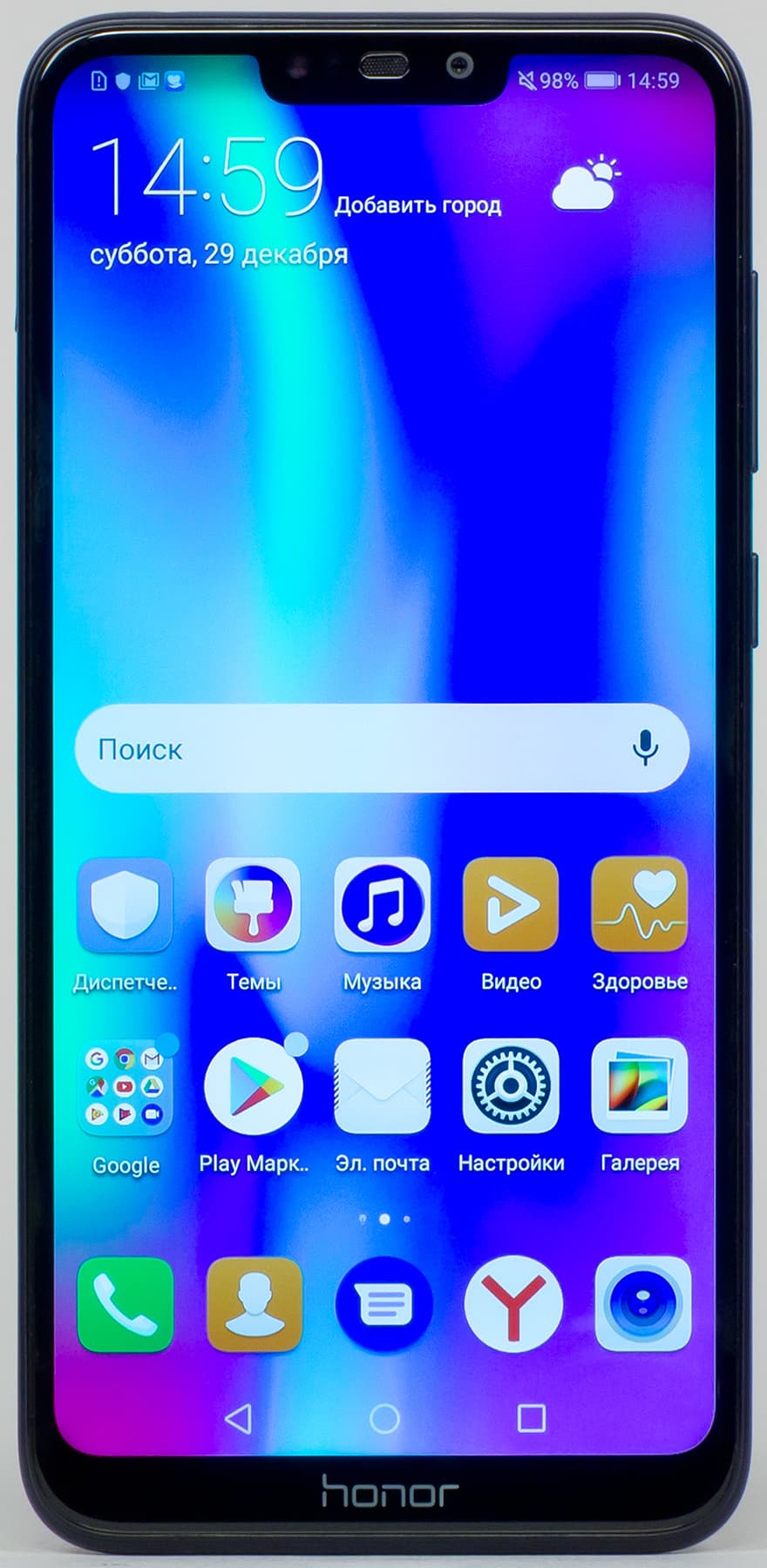 Honor 8C оснащен дисплеем IPS с размерами 68×143 мм при диагонали 6,26 дюйма, разрешение — 1520×720 (соотношение сторон 19:9), что дает плотность точек около 269 ppi. Ширина рамки с боков составляет 3,5 мм, отступ снизу — 10 мм, сверху — 5 мм (не считая, понятно, «челки»).