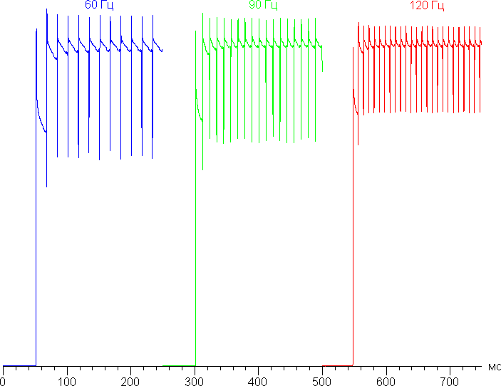 На высоком и среднем уровне яркости присутствует значимая модуляция с частотой примерно 60, 90 или 120 Гц. На рисунках ниже приведены зависимости яркости (вертикальная ось) от времени (горизонтальная ось) для нескольких значений настройки яркости. Сначала для режима с частотой обновления 60 Гц: