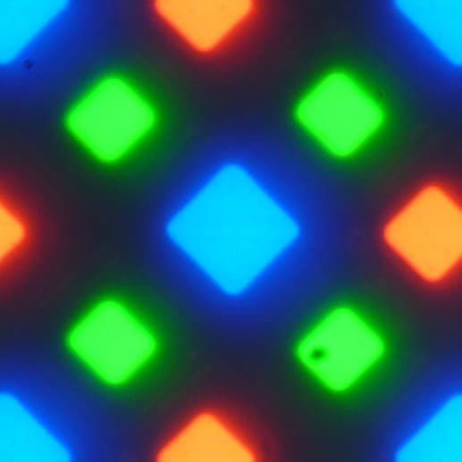 В этом экране используется матрица AMOLED — активная матрица на органических светодиодах. Полноцветное изображение создается с помощью субпикселей трех цветов — красного (R), зеленого (G) и синего (B), но красных и синих субпикселей в два раза меньше, что можно обозначить как RGBG. Это подтверждается фрагментом микрофотографии:
