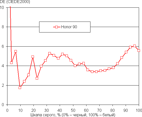 Напомним, что в случае OLED-экранов яркость фрагментов изображения динамично меняется в соответствии с характером выводимого изображения — чуть уменьшается для светлых в целом изображений. В итоге полученная зависимость яркости от оттенка (гамма-кривая), скорее всего, не соответствует гамма-кривой статичного изображения, так как измерения проводились при последовательном выводе оттенков серого почти на весь экран.