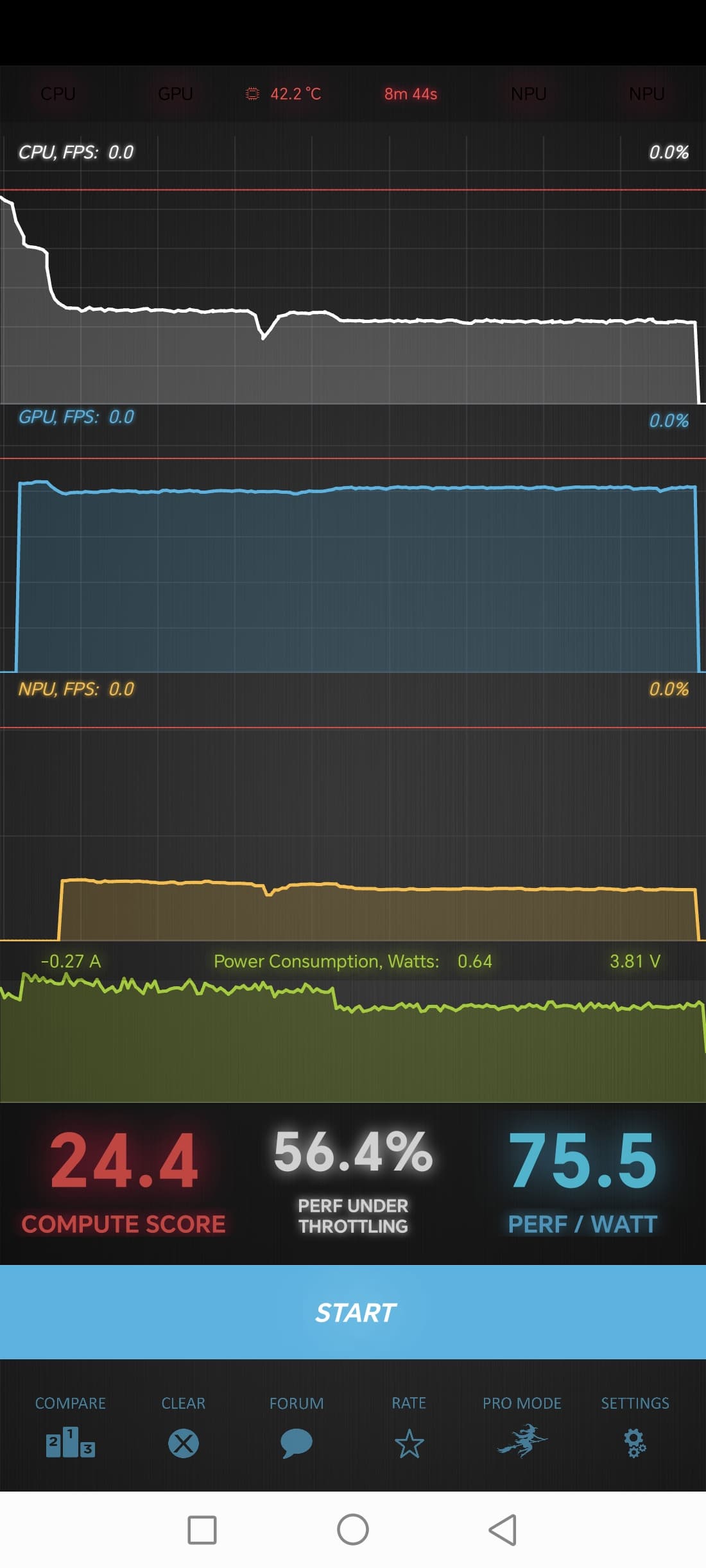 Тест на снижение производительности при нагреве мы проводим с помощью программы Burnout Benchmark, которая позволяет нагружать CPU, GPU и NPU: