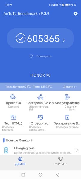 Смартфон Honor 90 получил батарею со стандартным объемом для сегодняшнего дня — 5000 мА·ч. В тестах аппарат демонстрирует достойную автономность — не рекордную, но вполне удовлетворительную.