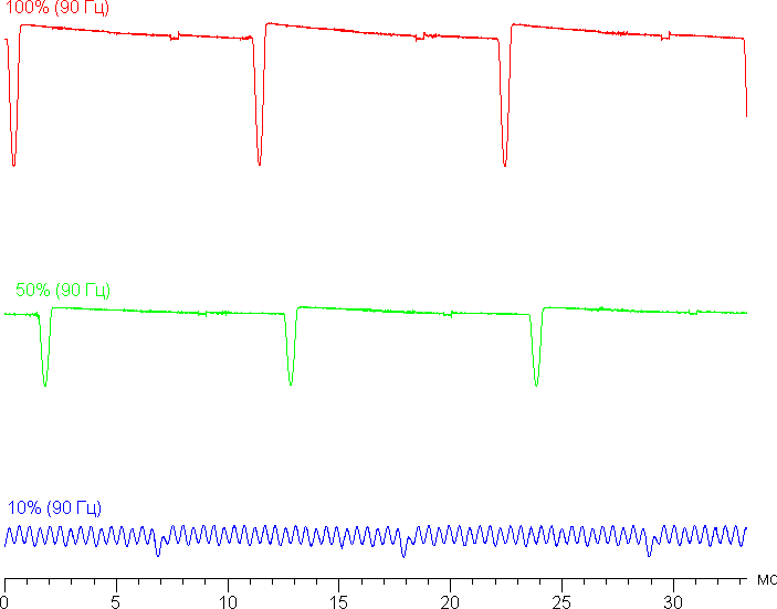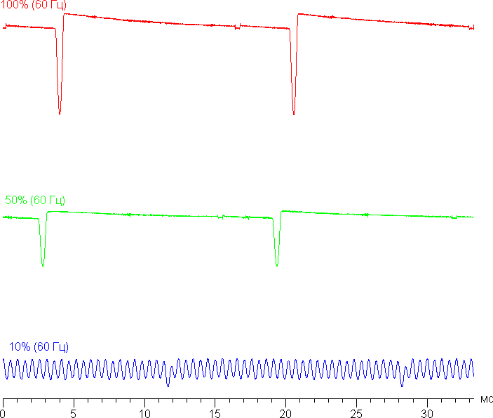 Видно, что на высокой и средней яркости частота невысокая (60 Гц), но и скважность модуляции низкая, в итоге видимого мерцания нет. При сильном понижении яркости появляется модуляция с высокой частотой (1,92 кГц) поэтому видимое мерцание всё так же отсутствует.