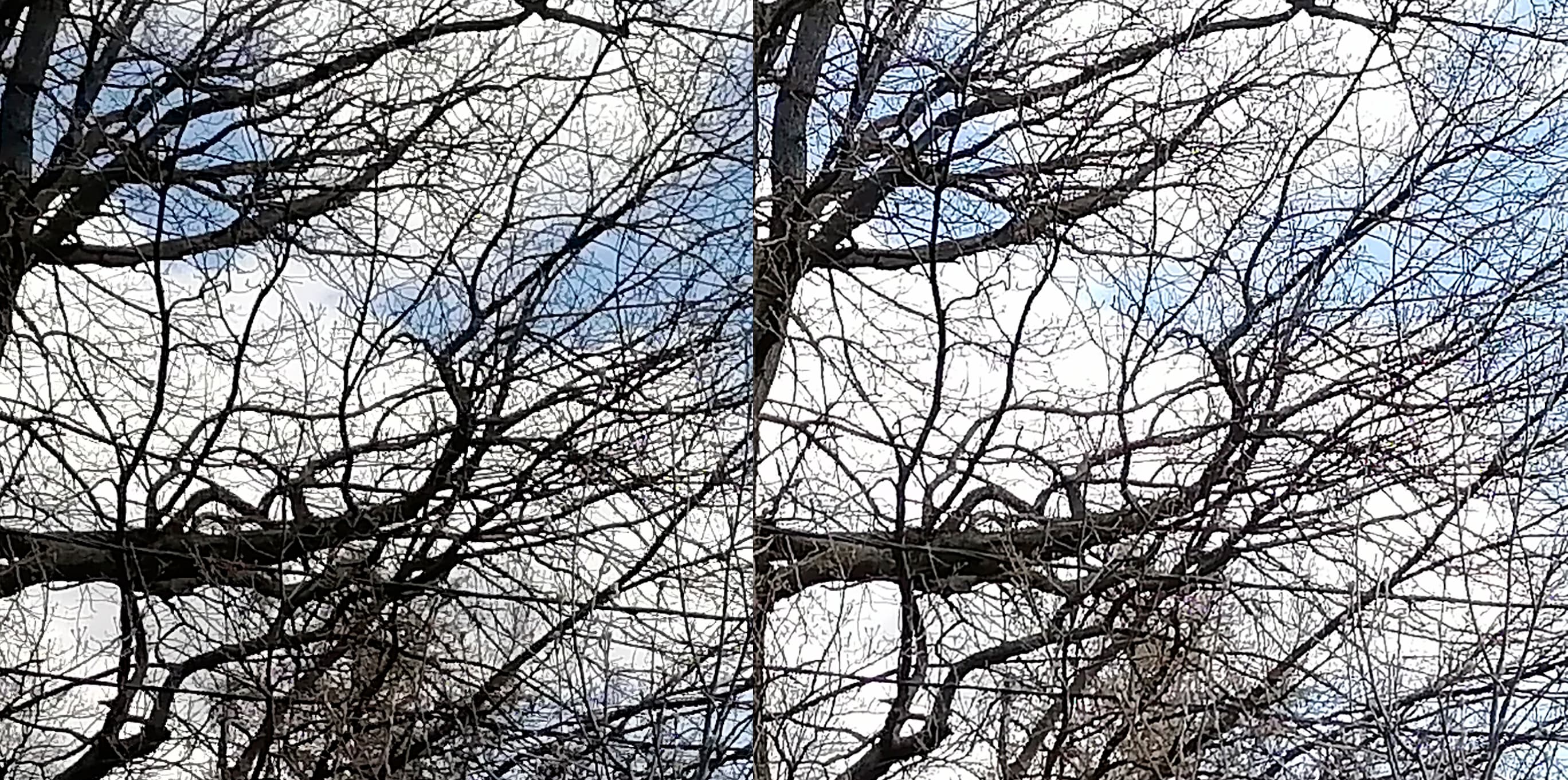 Основной модуль по умолчанию снимает в разрешении 12 Мп, используя технологию «четыре пикселя в одном». Если снимать в полном разрешении, то интерфейс камеры перестает предлагать функции зумирования и автоматические настройки для сценических режимов с применением ИИ. Никакого выигрыша от съемки в режиме 48 Мп нет, степень детализации (она могла бы пригодиться при использовании фрагментов фотографий) в нём не выше, чем если бы тот же фрагмент снимка, снятого в 12 Мп, был растянут в любом графическом редакторе.