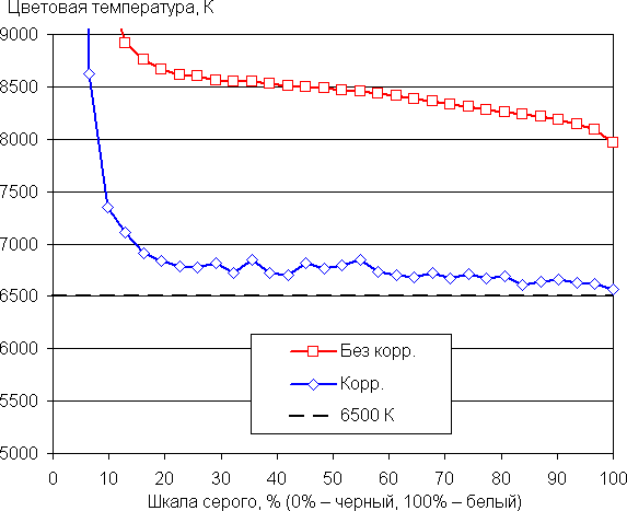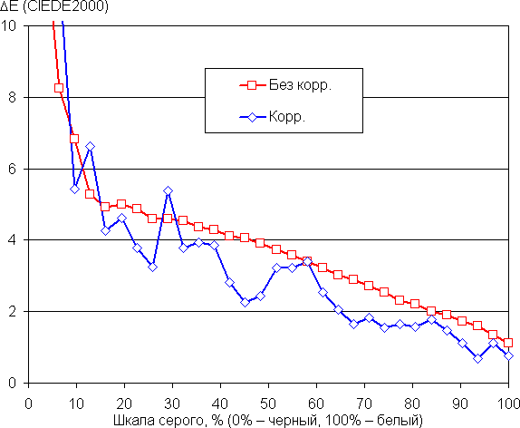 Баланс оттенков на шкале серого в варианте По умолчанию компромиссный, так как цветовая температура существенно выше стандартных 6500 К, но отклонение от спектра абсолютно черного тела (ΔE) ниже 10, что для потребительского устройства считается хорошим показателем. Мы попробовали выполнить коррекцию, передвинув точку на круге в положение, как на снимке выше. На графиках ниже кривые Без корр. соответствуют результатам, полученным после выбора профиля По умолчанию, а кривые Корр. — данным, полученным после коррекции. (Самые темные области шкалы серого можно не учитывать, так как там баланс цветов не имеет большого значения, да и погрешность измерений цветовых характеристик на низкой яркости большая.)