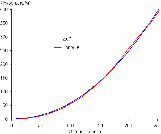 Контрастность (примерно в центре экрана) высокая — порядка 1400:1. Время отклика при переходе черный-белый-черный равно 21 мс (10 мс вкл. + 11 мс выкл.). Переход между полутонами серого 25% и 75% (по численному значению цвета) и обратно в сумме занимает 34 мс. Построенная по 32 точкам с равным интервалом по численному значению оттенка серого гамма-кривая не выявила завала ни в светах, ни в тенях. Показатель аппроксимирующей степенной функции равен 2,09, что немного ниже стандартного значения 2,2. При этом реальная гамма-кривая слегка отклоняется от степенной зависимости: