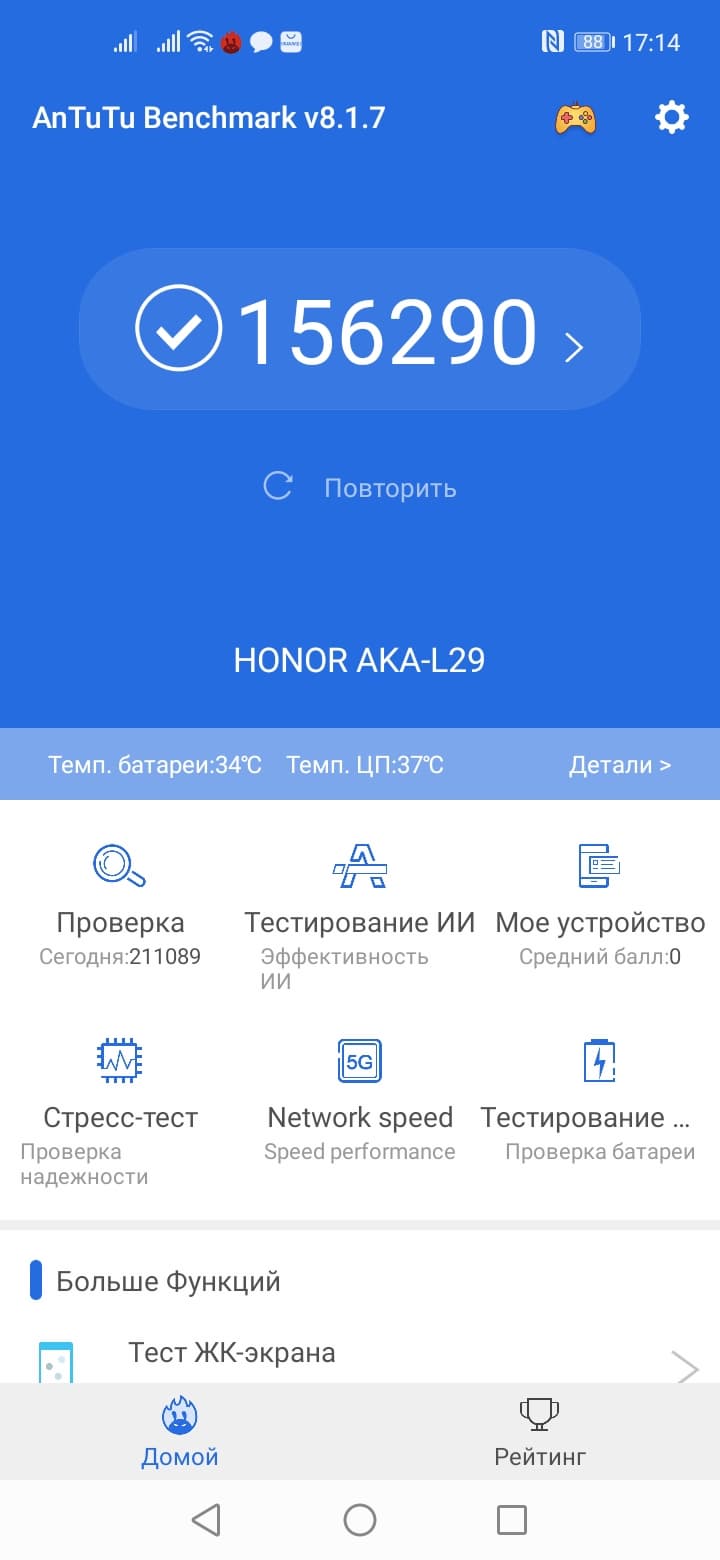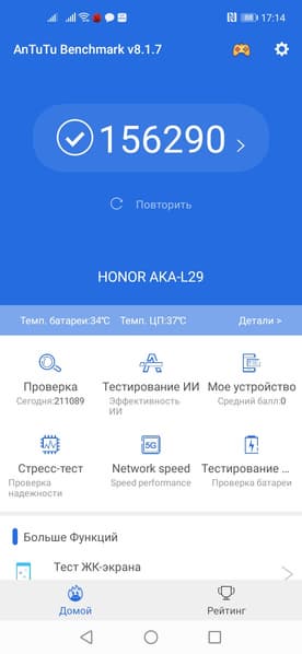 | AnTuTu (v8.x) (больше — лучше) | 156290 | 208142 | 227198 | 174316 |