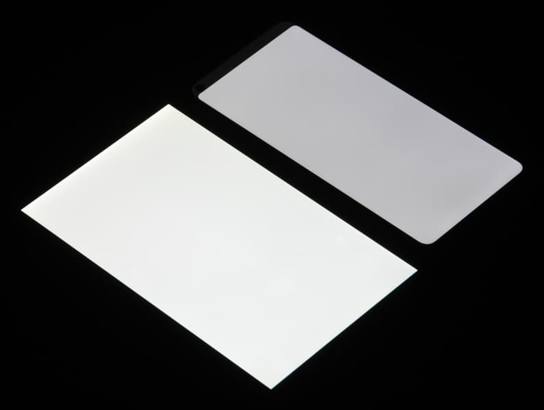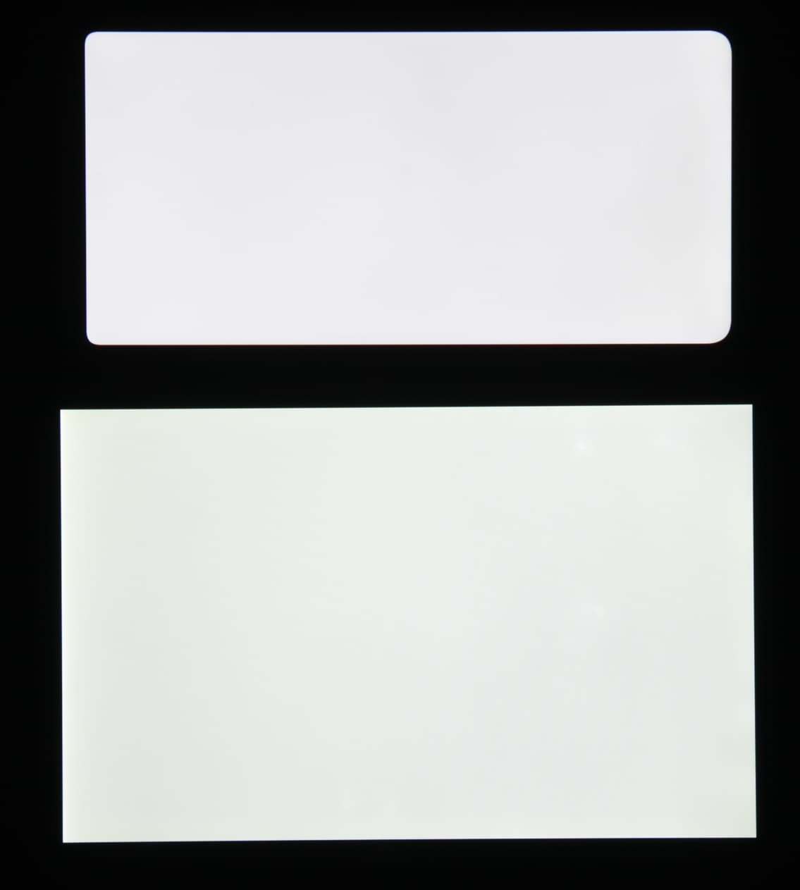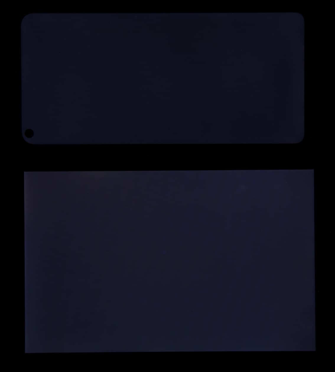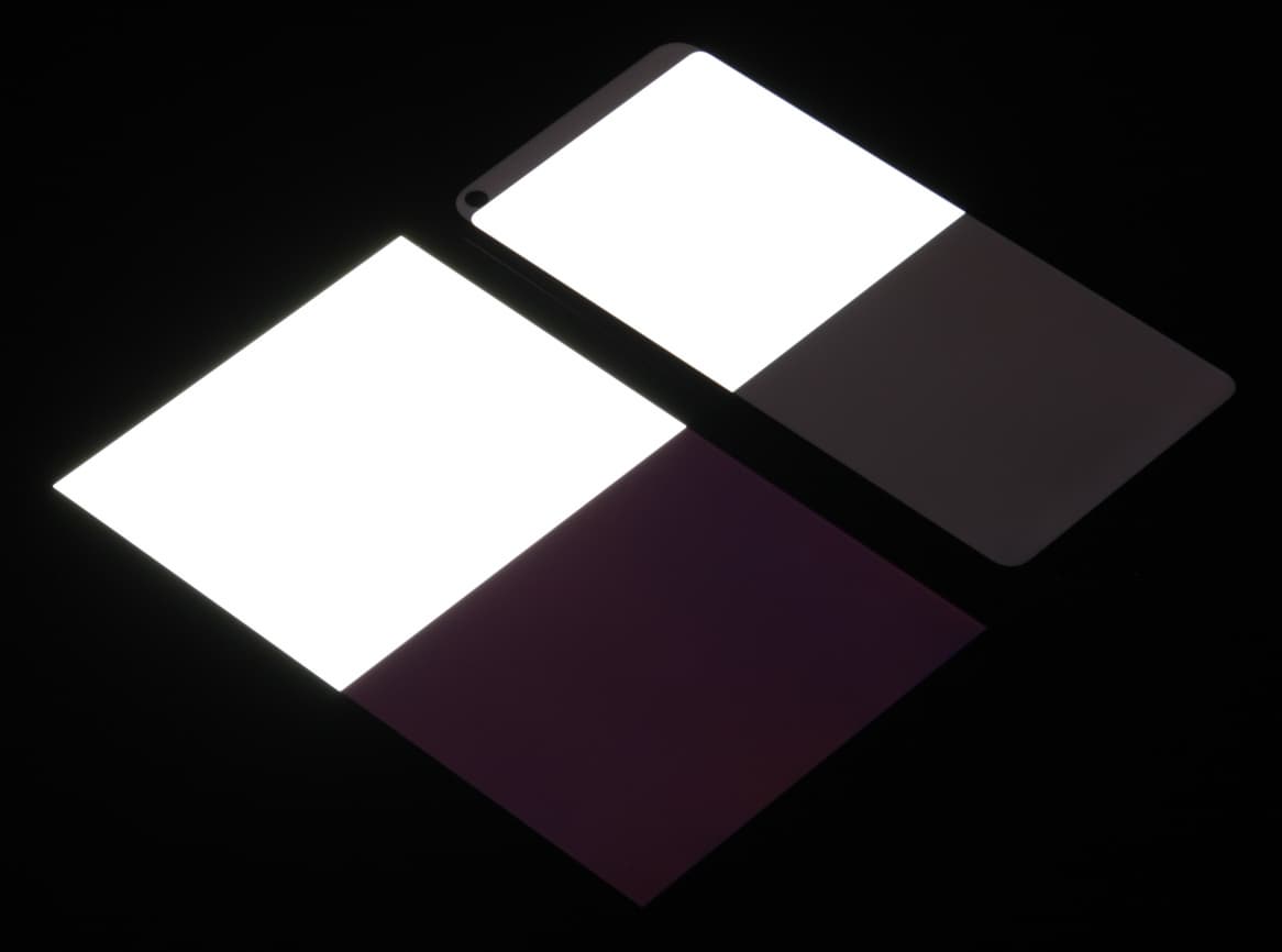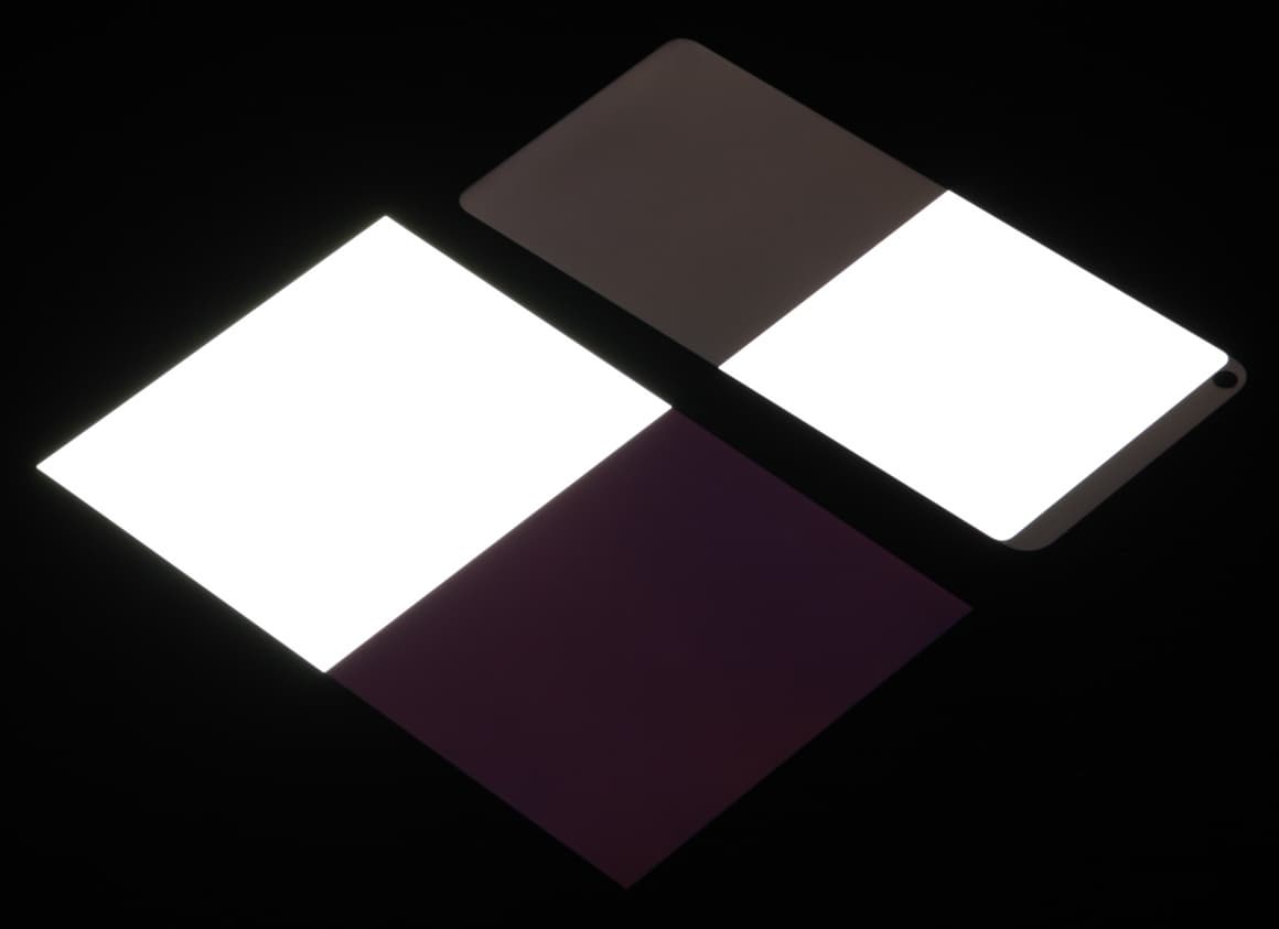Яркость под углом у экранов уменьшилась (как минимум в 5 раз, исходя из разницы в выдержке), но у смартфона снижение заметно больше. Черное поле при отклонении по диагонали высветляется сильно и приобретает чуть красноватый оттенок. Фотографии ниже это демонстрируют (яркость белых участков в перпендикулярном плоскости экранов направлении одинаковая!):