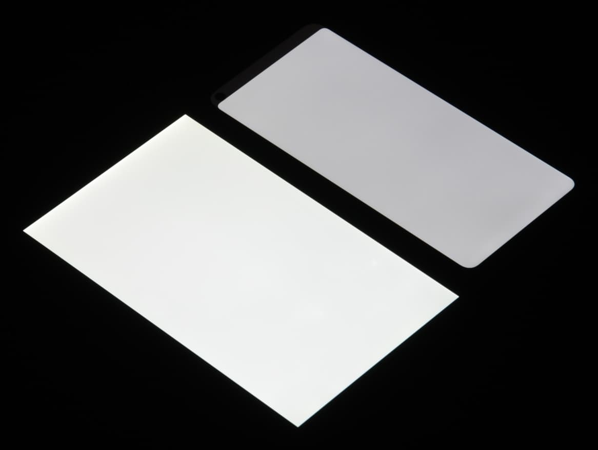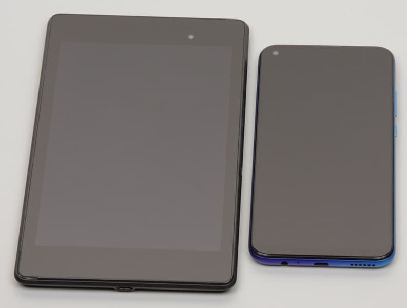 Лицевая поверхность экрана выполнена в виде стеклянной пластины с зеркально-гладкой поверхностью, устойчивой к появлению царапин. Судя по отражению объектов, антибликовые свойства экрана лучше, чем у экрана Google Nexus 7 (2013) (далее просто Nexus 7). Для наглядности приведем фотографию, на которой в выключенных экранах отражается белая поверхность (слева — Nexus 7, справа — Honor 9C, далее их можно различать по размеру):