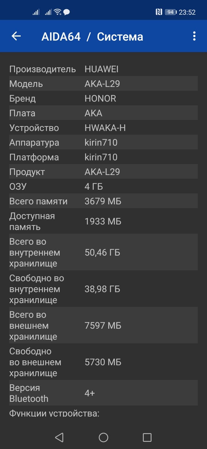 - SoC Kirin 710, 8 ядер: 4×Cortex-A73 @2,2 ГГц + 4×Cortex-A53 @1,7 ГГц