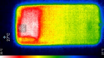 Нагрев выше в верхней части аппарата, что, видимо, соответствует расположению микросхемы SoC. По данным теплокамеры, максимальный нагрев составил всего 36 градусов (при температуре окружающего воздуха в 24 градуса), это относительно немного.