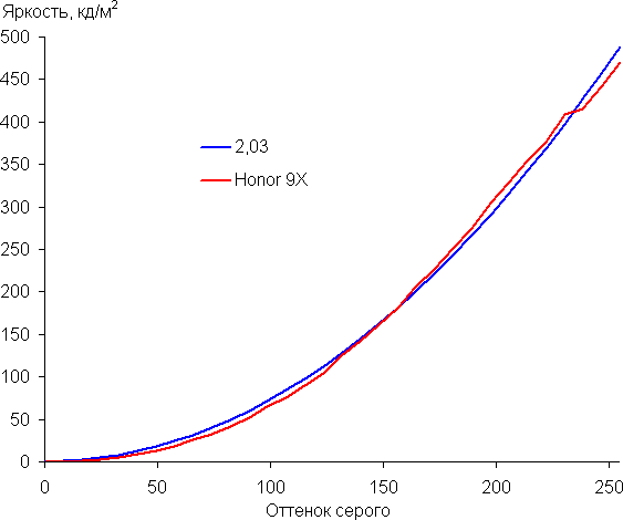 Контрастность (примерно в центре экрана) высокая — порядка 1150:1. Время отклика при переходе черный-белый-черный равно 17 мс (8,5 мс вкл. + 8,5 мс выкл.). Переход между полутонами серого 25% и 75% (по численному значению цвета) и обратно в сумме занимает 28 мс. Построенная по 32 точкам с равным интервалом по численному значению оттенка серого гамма-кривая не выявила завала ни в светах, ни в тенях. Показатель аппроксимирующей степенной функции равен 2,03, что ниже стандартного значения 2,2. При этом реальная гамма-кривая заметно отклоняется от степенной зависимости: