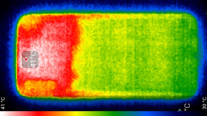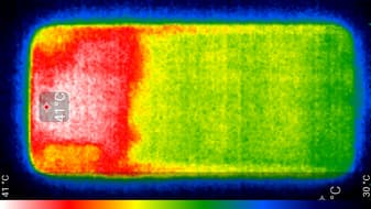 Нагрев выше в верхней части аппарата, что, видимо, соответствует расположению микросхемы SoC. По данным теплокамеры, максимальный нагрев составил 41 градус (при температуре окружающего воздуха в 24 градуса), это средний нагрев в данном тесте для современных смартфонов.