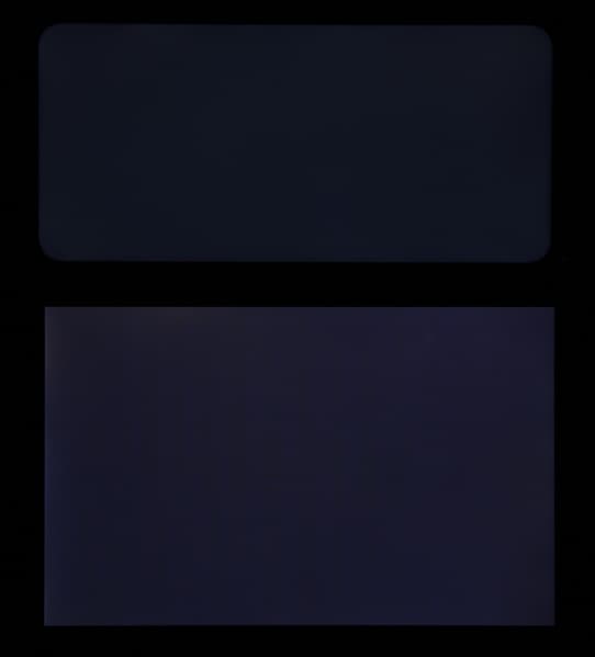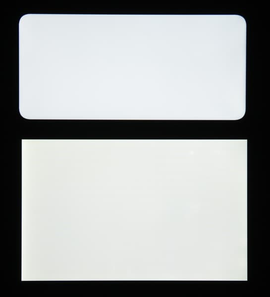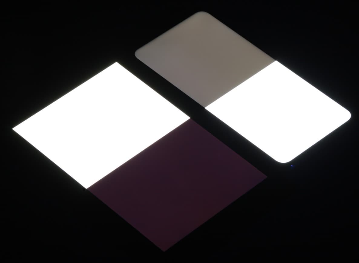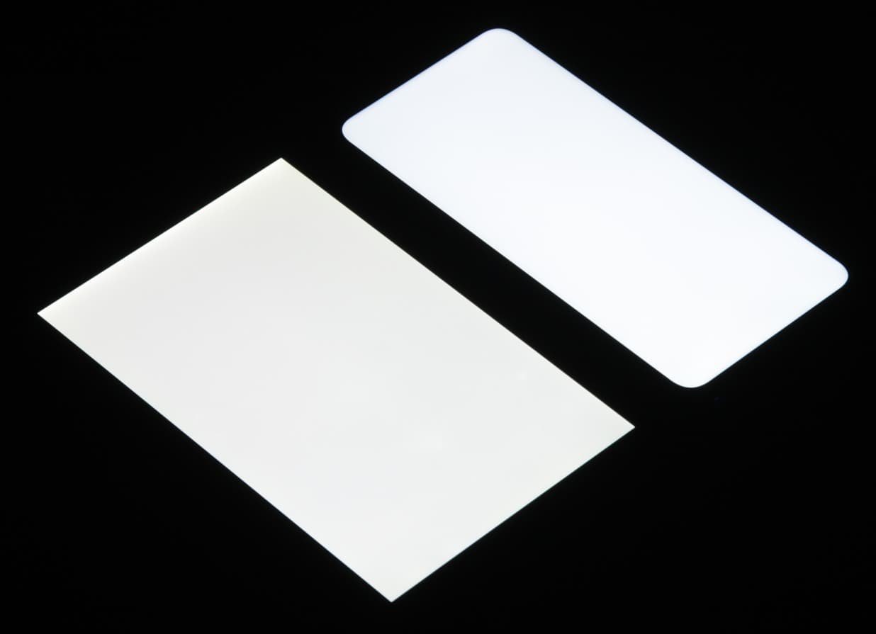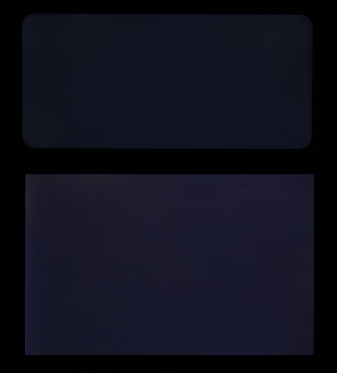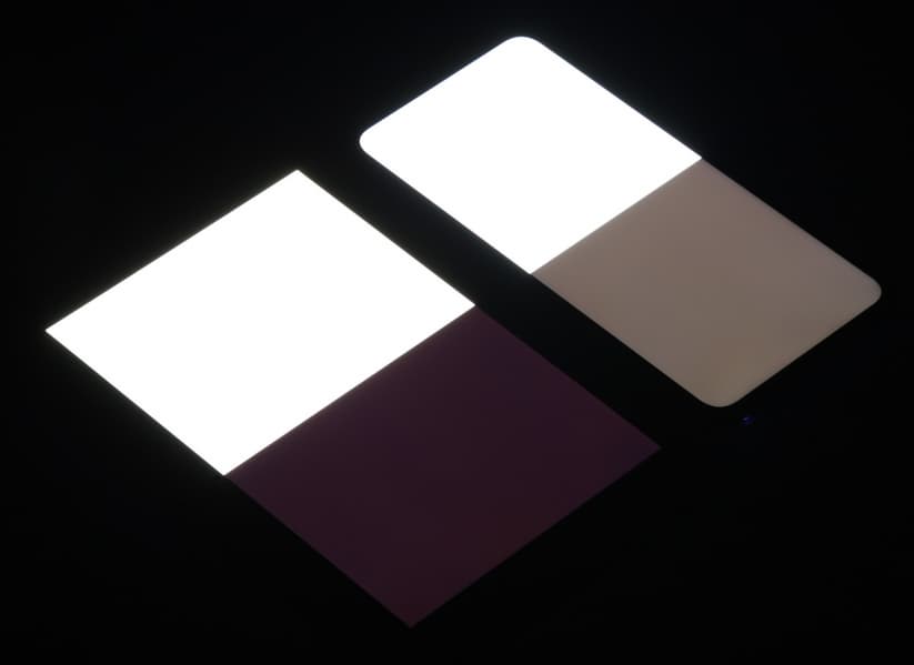Яркость под углом у экранов уменьшилась (примерно в 5 раз, исходя из разницы в выдержке), но у Honor 9X экран все же немного светлее. Черное поле при отклонении по диагонали высветляется сильно и остается условно нейтрально-серным. Фотографии ниже это демонстрируют (яркость белых участков в перпендикулярном плоскости экранов направлении одинаковая!):