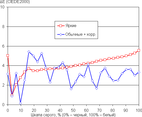 По умолчанию (выбран профиль Яркие) баланс оттенков на шкале компромиссный, так как цветовая температура существенно выше стандартных 6500 К, но отклонение от спектра абсолютно черного тела (ΔE) ниже 10, что для потребительского устройства считается приемлемым показателем. При этом цветовая температура и ΔE мало изменяются от оттенка к оттенку — это положительно сказывается на визуальной оценке цветового баланса. (Самые темные области шкалы серого можно не учитывать, так как там баланс цветов не имеет большого значения, да и погрешность измерений цветовых характеристик на низкой яркости большая.)