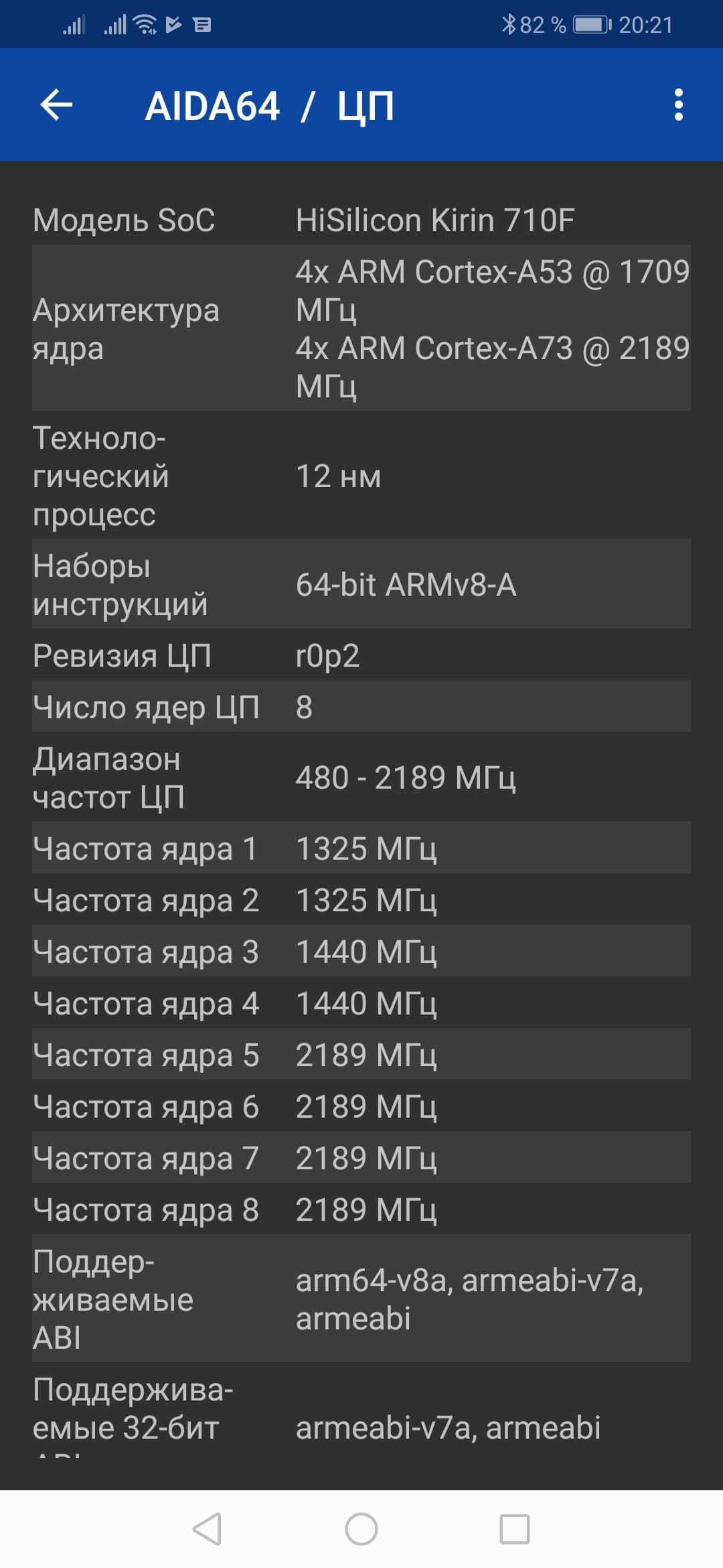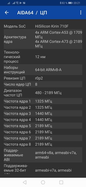 - SoC Kirin 710F, 8 ядер: 4×Cortex-A73 @2,2 ГГц + 4×Cortex-A53 @1,7 ГГц