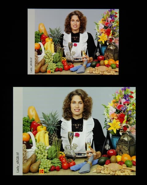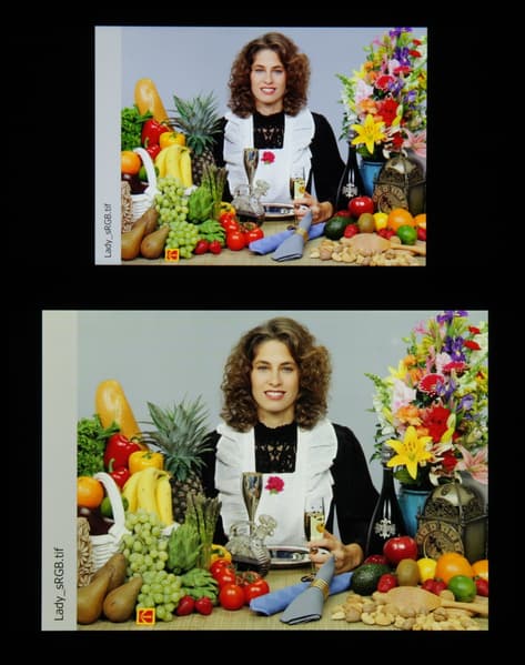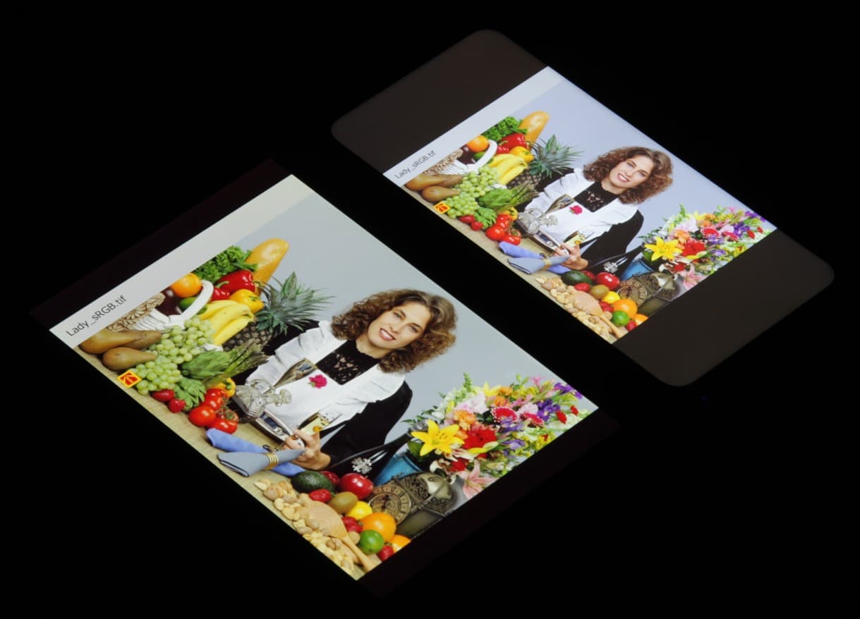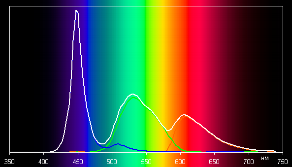 Спектры компонент достаточно хорошо разделены, что и обуславливает широкий цветовой охват. Для потребительского устройства широкий цветовой охват является никак не достоинством, а существенным недостатком, поскольку в итоге цвета изображений — рисунков, фотографий и фильмов, — ориентированных на пространство sRGB (а таких подавляющее большинство), имеют неестественную насыщенность. Особенно это заметно на узнаваемых оттенках, например на оттенках кожи. Результат приведен на фотографиях выше.