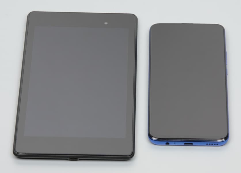Лицевая поверхность экрана выполнена в виде стеклянной пластины с зеркально-гладкой поверхностью, устойчивой к появлению царапин. Судя по отражению объектов, антибликовые свойства экрана лучше, чем у экрана Google Nexus 7 (2013) (далее просто Nexus 7). Для наглядности приведем фотографию, на которой в выключенных экранах отражается белая поверхность (слева — Nexus 7, справа — Honor 9X, далее их можно различать по размеру):