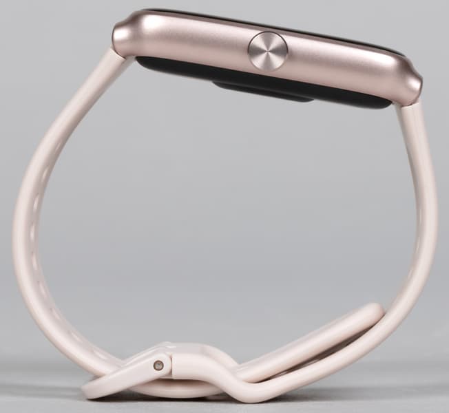 Тыльная поверхность корпуса браслета, прилегающая к руке, пластиковая. Помимо чуть выступающий круглой площадки с оптическими сенсорами для измерения пульса и кислорода в крови здесь видны два контакта для подсоединения зарядного устройства.