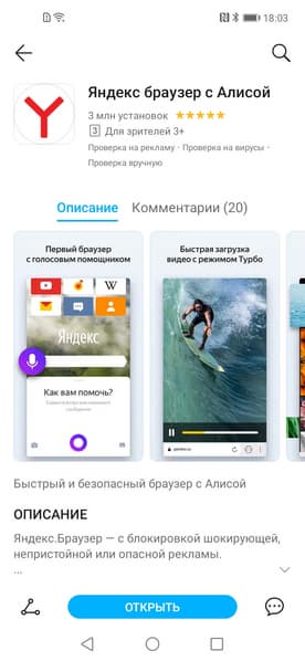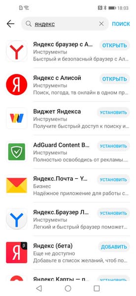 Яндекс делает самые популярные в России онлайн-сервисы и программы для работы с ними. К счастью, все мобильные приложения Яндекса давно есть в магазине AppGallery. Установить их просто: запустить AppGallery, в поисковой строке сверху набрать «Яндекс» и в списке результатов нажать «Установить» возле нужного приложения.