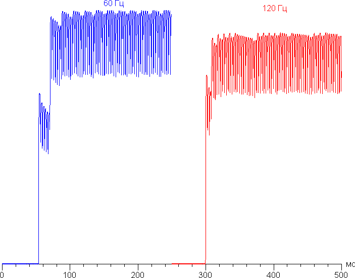 Переключение состояния элементов матрицы выполняется практически мгновенно, но на фронте включения может присутствовать ступенька шириной примерно 17 мс (что соответствует частоте обновления экрана примерно в 60 Гц) или примерно 8 мс (120 Гц). Например, так выглядит зависимость яркости от времени при переходе от черного к белому: