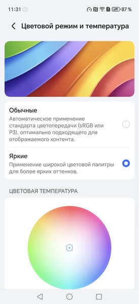 Фотография выше получена при активном профиле Обычные [цвета] в настройках экрана, всего их два: