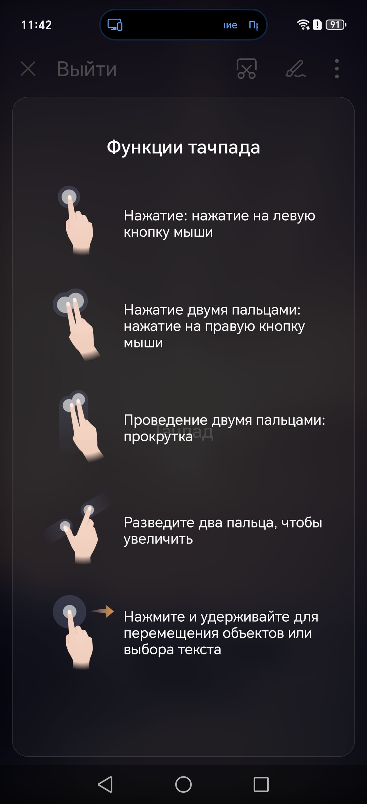 При этом экран смартфона может использоваться в качестве сенсорной панели координатного ввода, быть планшетом для рисования поверх рабочего стола или работать как обычно, вторым рабочим столом небольшого размера.