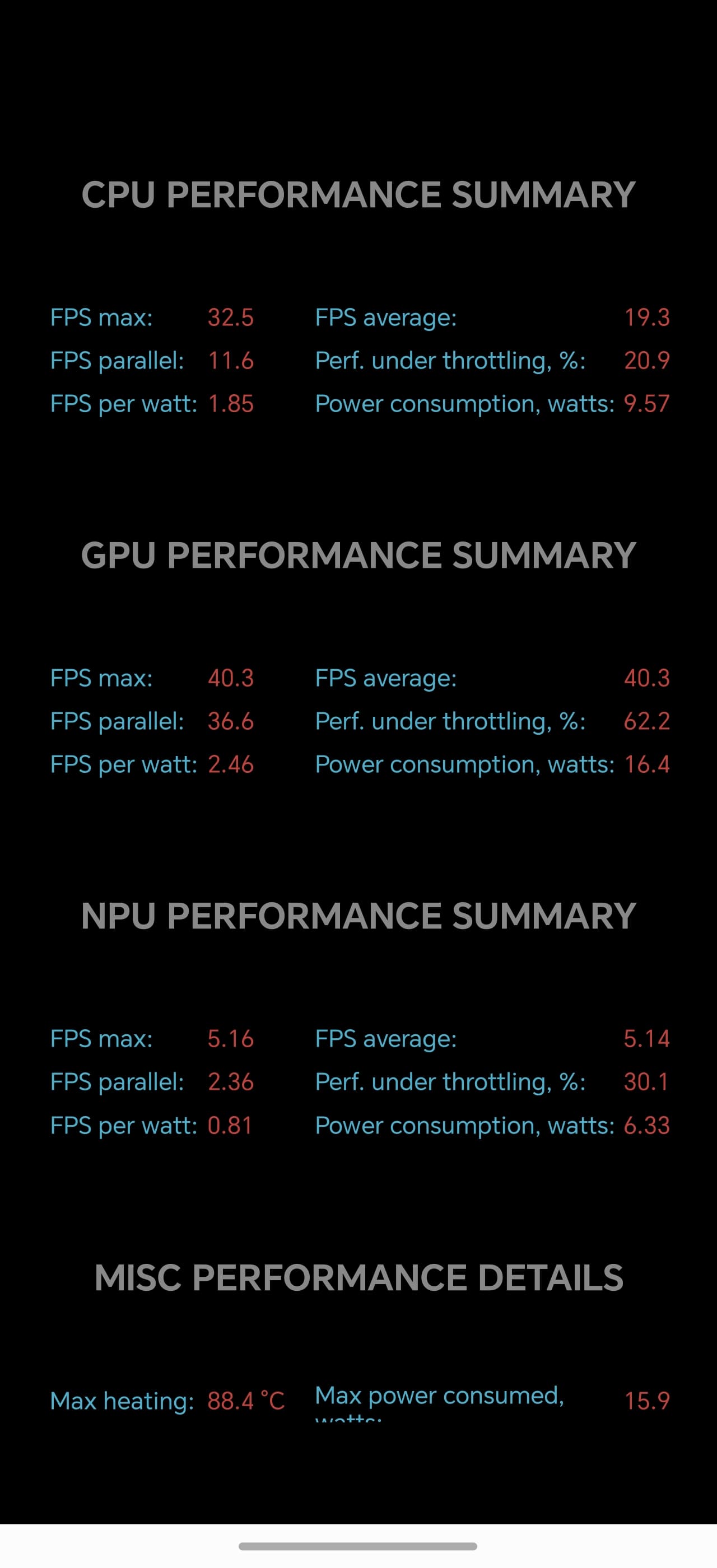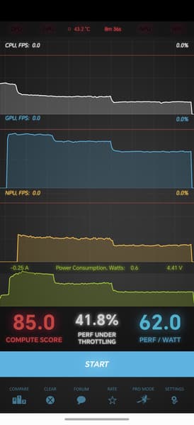 Тест на снижение производительности при нагреве мы проводим с помощью программы Burnout Benchmark, которая позволяет нагружать CPU, GPU и NPU: