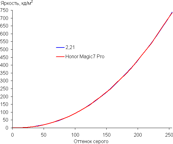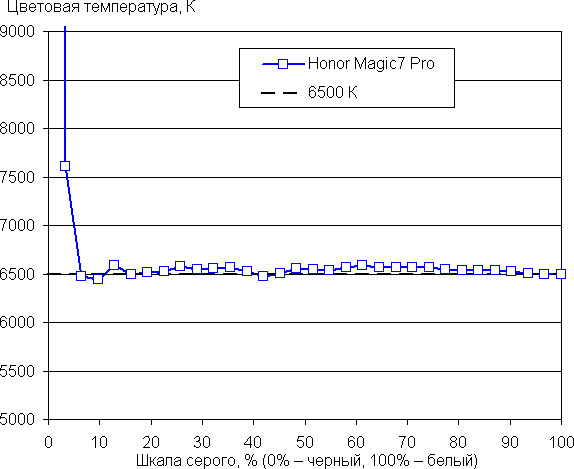 Напомним, что в случае OLED-экранов яркость фрагментов изображения динамично меняется в соответствии с характером выводимого изображения — чуть уменьшается для светлых в целом изображений. В итоге полученная зависимость яркости от оттенка (гамма-кривая), скорее всего, не соответствует гамма-кривой статичного изображения, так как измерения проводились при последовательном выводе оттенков серого почти на весь экран.