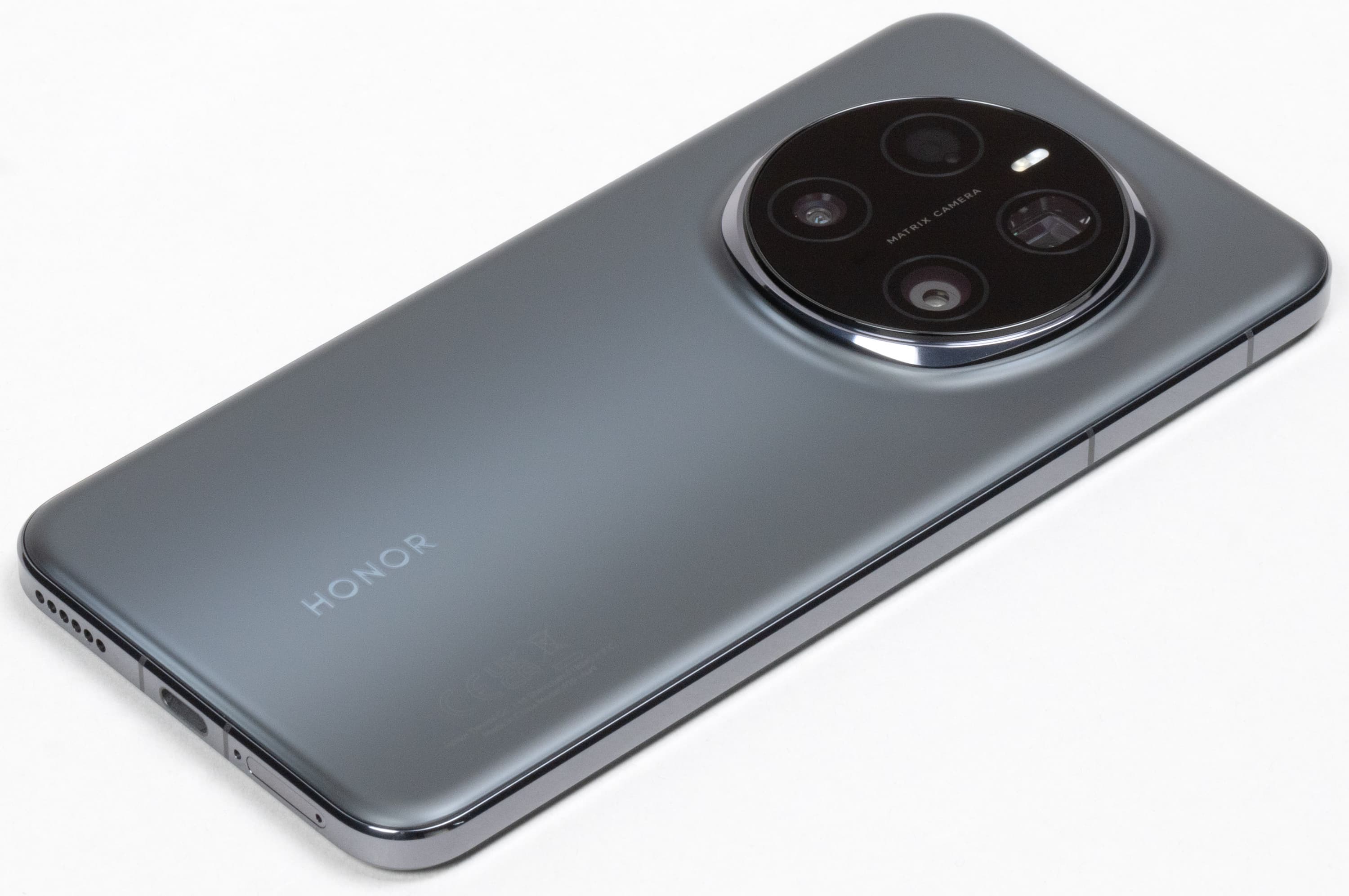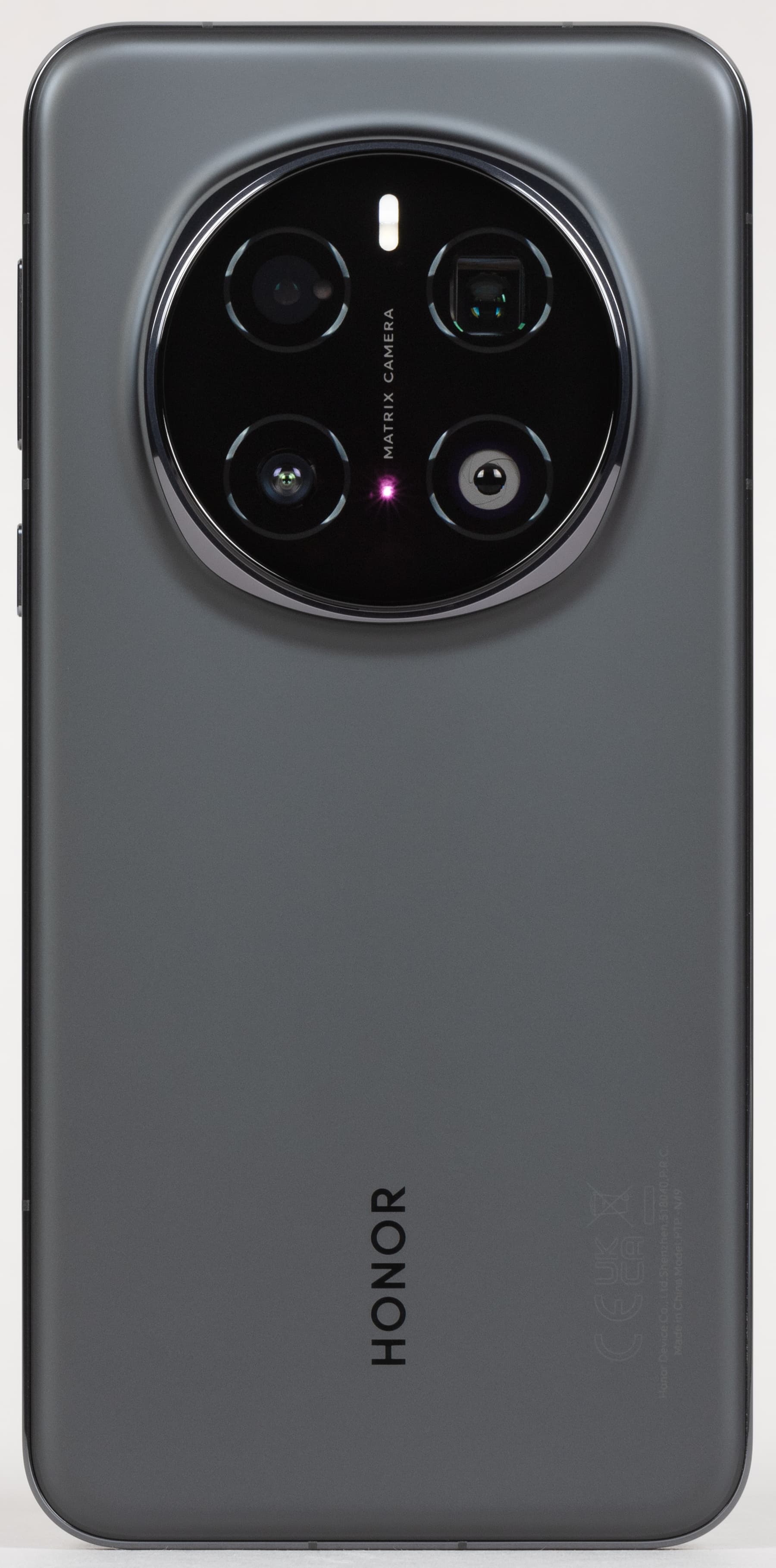 Единственное украшение — блестящий хромированный ободок вокруг выступающего круглого блока камер. Этот элемент бросается в глаза и определяет визуальное различие с предыдущей моделью, которая отличается лишь формой этого ободка: у Honor Magic 6 Pro был восьмиугольник. К слову, новинка и по размеру корпуса немного шире своего предшественника (77,1 мм против 75,8 мм).