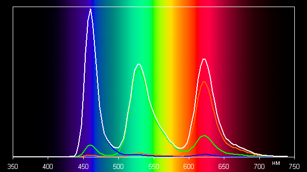 В первом случае спектры компонент (то есть спектры чистых красного, зеленого и синего цветов) очень хорошо разделены: